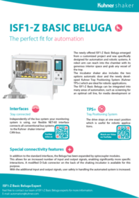 The incubator shaker also includes the two options automatic door and the newly developed Kuhner Tray Positioning System (Kuhner TPS+) which are essential for robotic applications. The ISF1-Z Basic Beluga can be integrated into many areas of automation, such as screening for an optimal cell line, for media development or analytical applications.